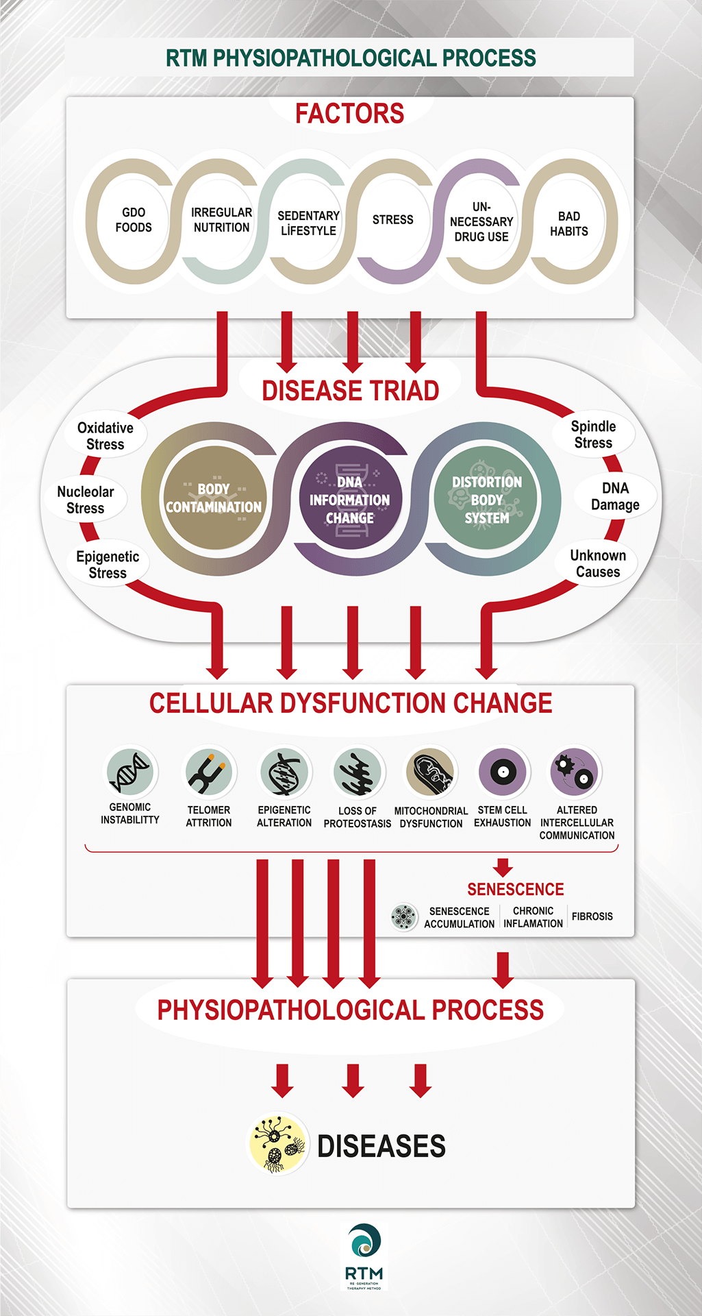 In the RTM system, diseases are new life values that the body develops against the conditions that affect it. Evaluating these new values in the "Source - Cause - Result" relationship, RTM aims at permanent healing with treatment plans for the infrastructure in the "source" part, which pushes the body to new values, instead of suppressing the "results" (symptoms of disease) in treatment.